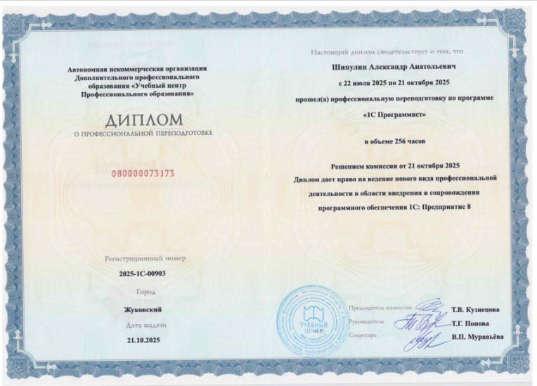 Прошел профессиональную переподготовку по программе "1С Программист".